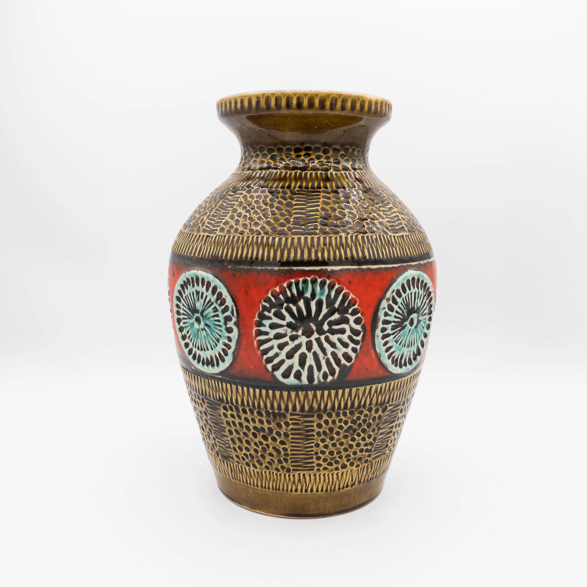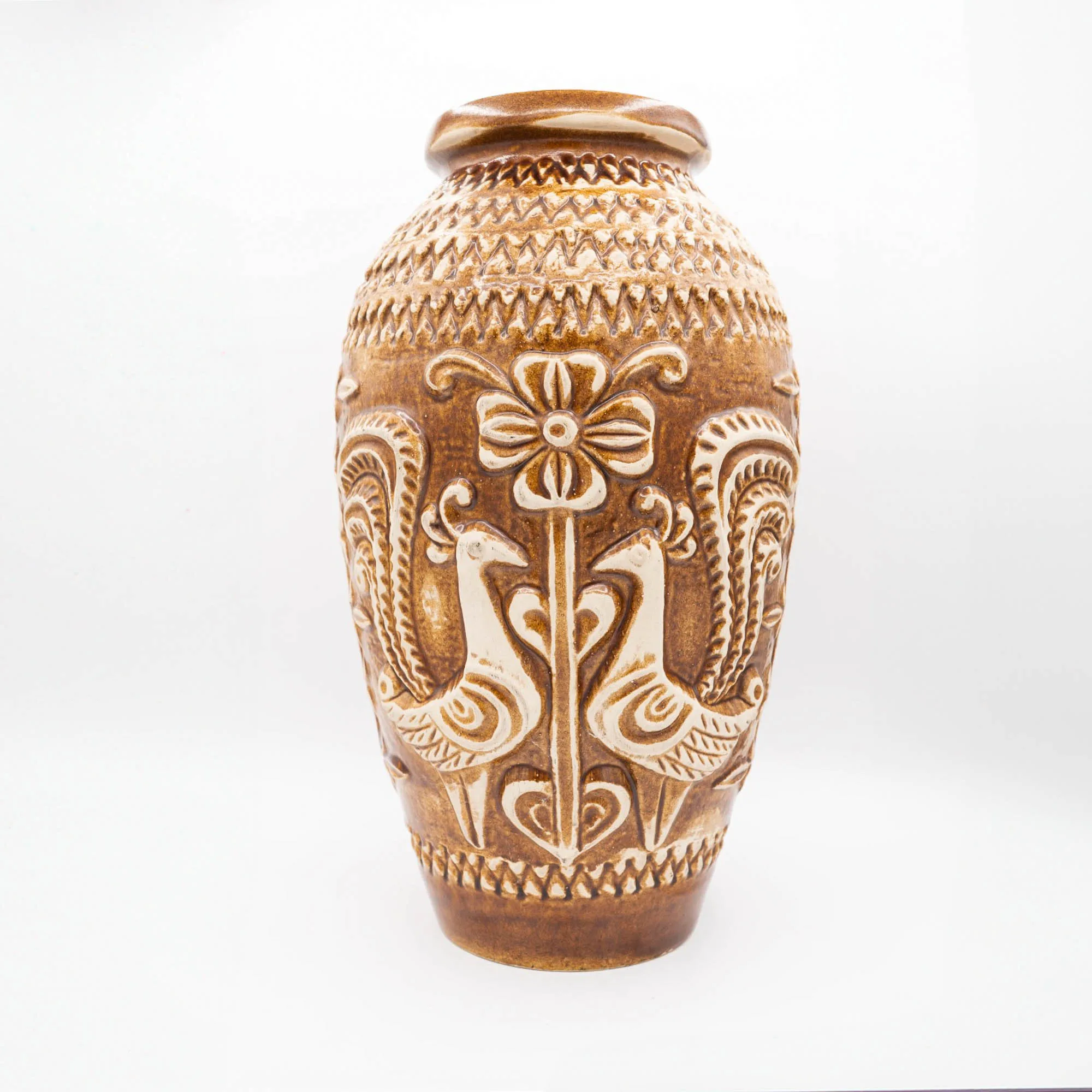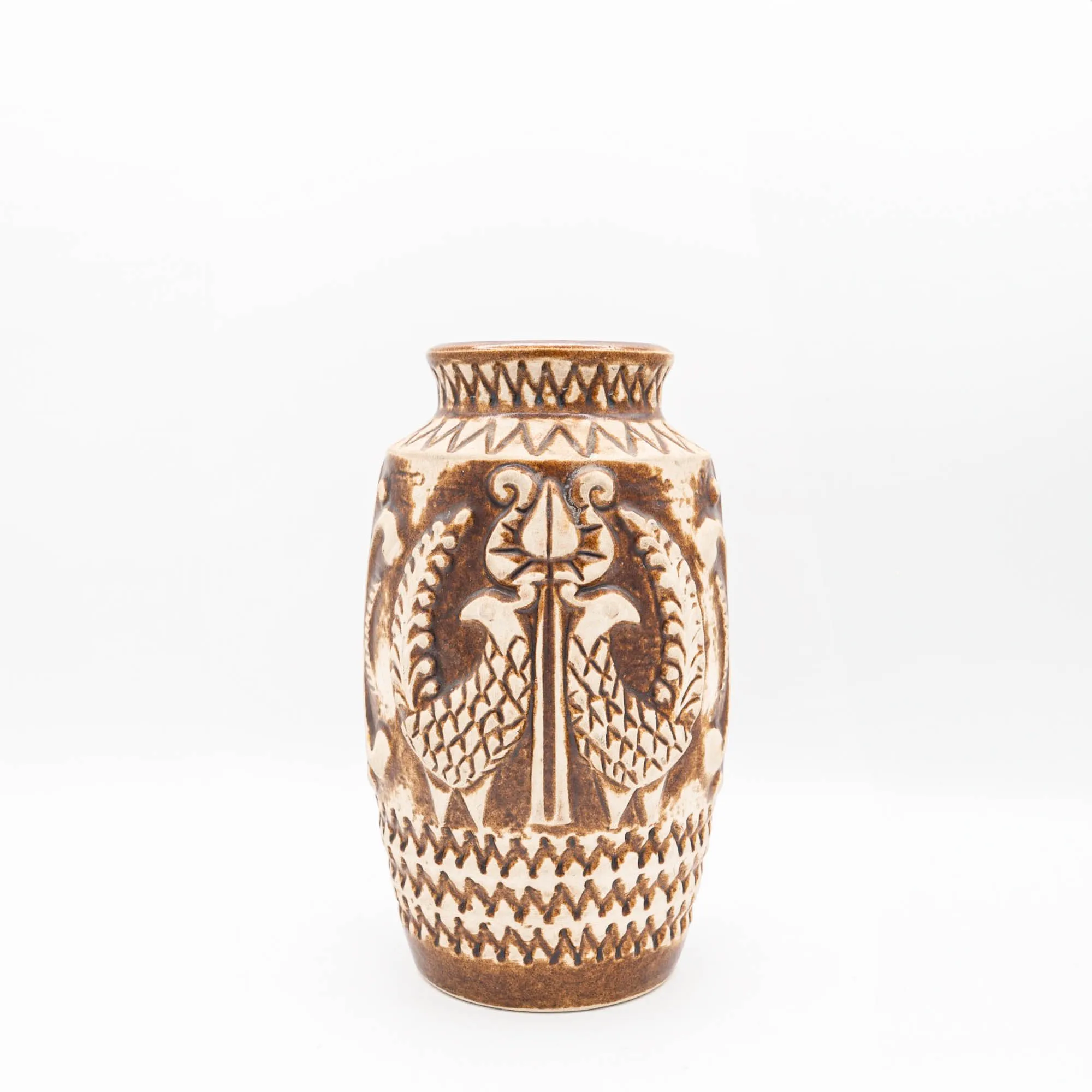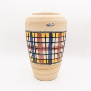Bay Keramik used white clay for it’s production. The vases usually are clearly marked on the base with a moulded identification: two or three digits for the form, followed by a dash and the height in cm’s. Many vases also still have a Bay sticker, which makes identification very easy.