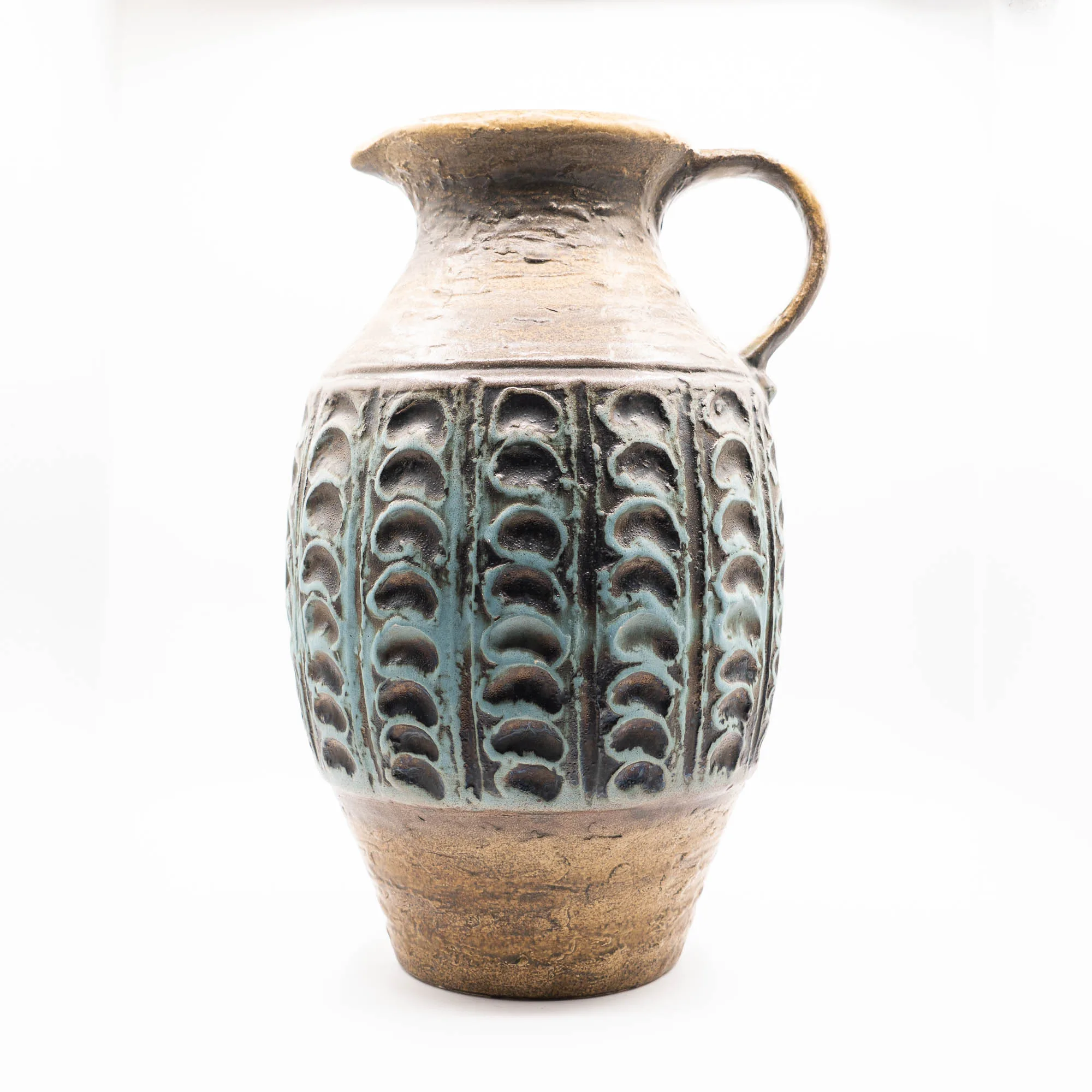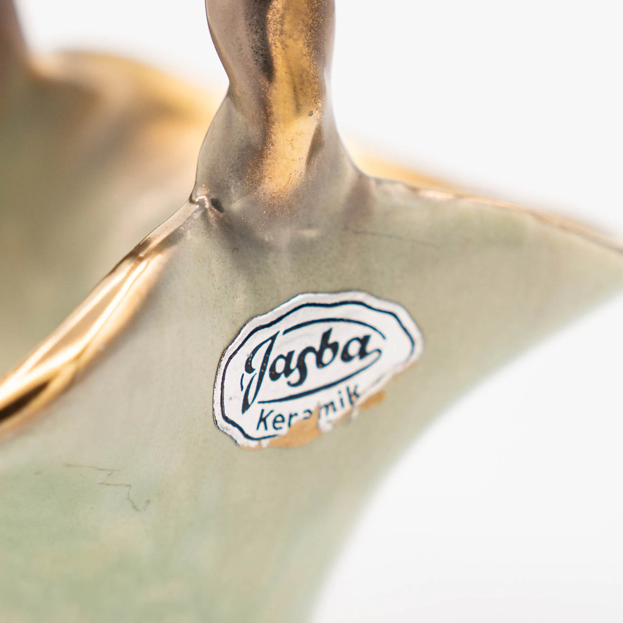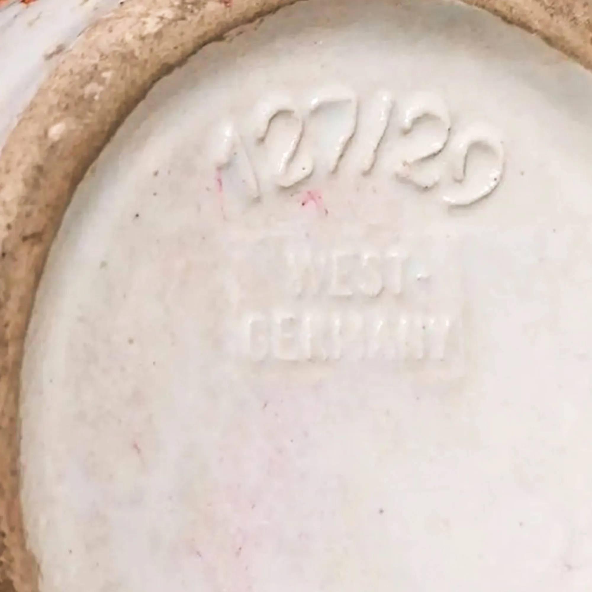 Jasba art pottery is easily recognized by its use of white clay and a variety of marks, including incised or embossed “JASBA” on the base, sometimes within a raised square or simply marked “West Germany”. Form numbers and height are separated by an “/”. The distinctive “N” series features numbers starting with “N.” Jasba pieces may also have original paper, foil, or wax labels.