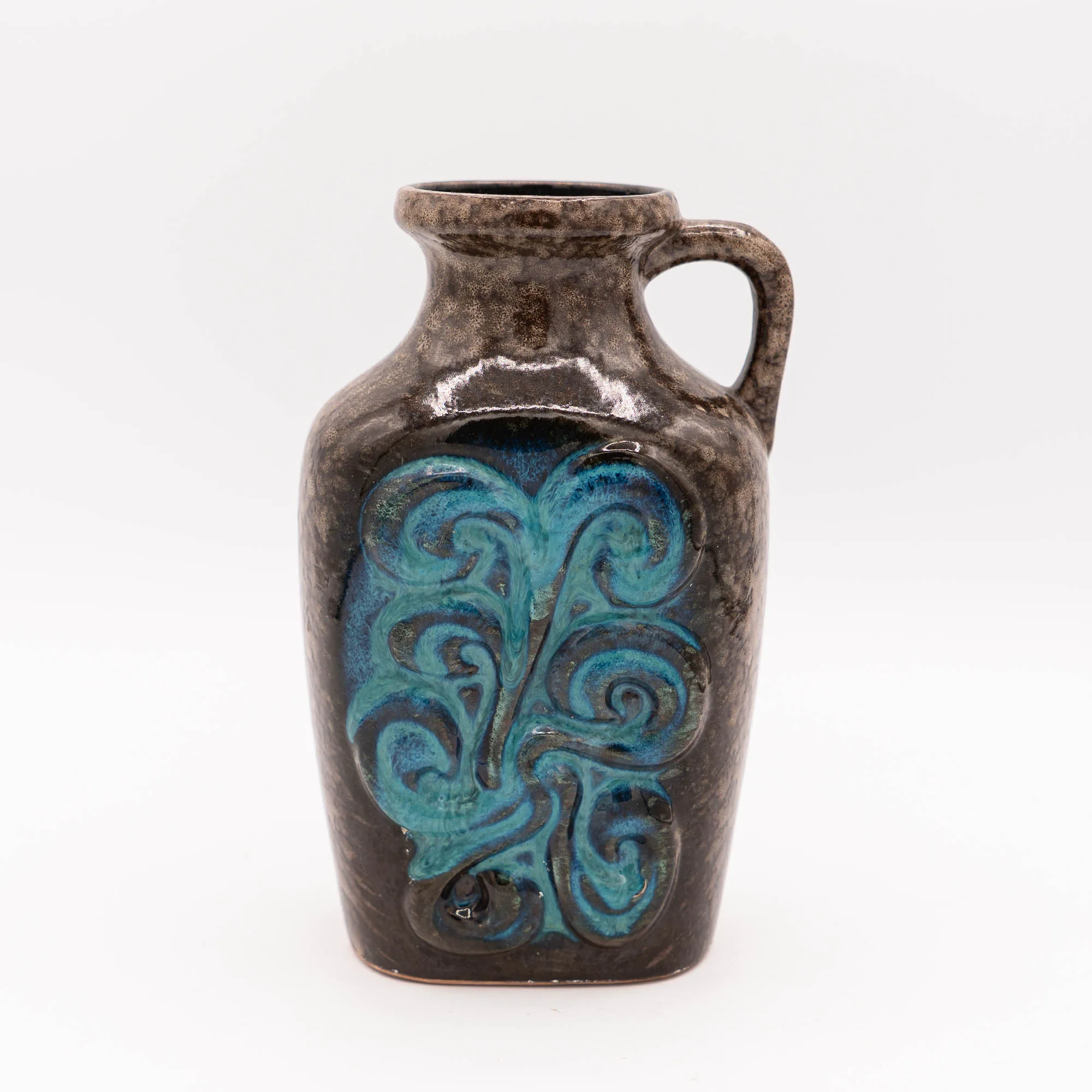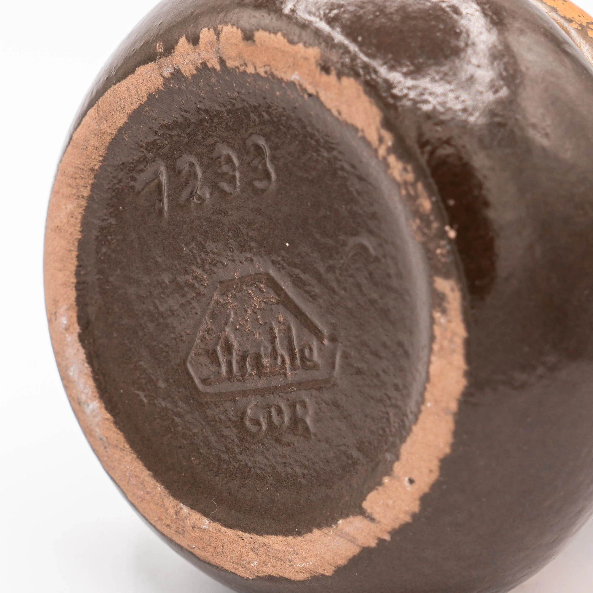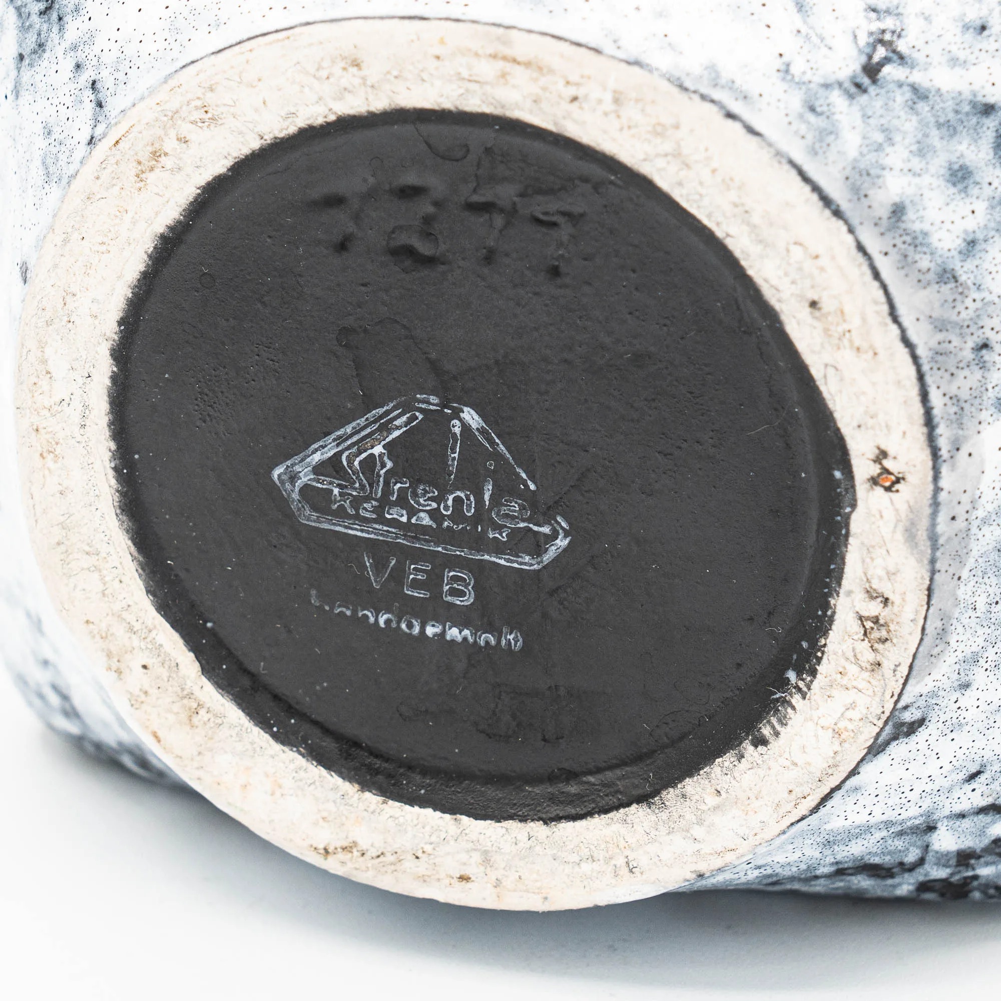 Strehla ceramics are typically identified by a “Strehla Keramik” mark within a triangle on the base, either ink stamped (in white or black) or moulded. Many pieces also include “Made in GDR,” “VEB,” or “Import handgemalt,” and often have a moulded form number in a hand-writing font. The pottery is usually made from white or light brown clay and features hand-applied glazes or lava textures.